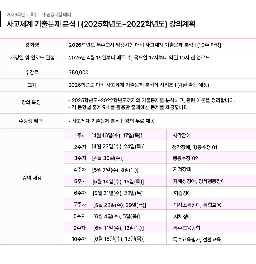 제 목 [김태구 특수] 2026학년도 사고체계 기출문제 분석 I (2025학년도~2022학년도) 강의계획